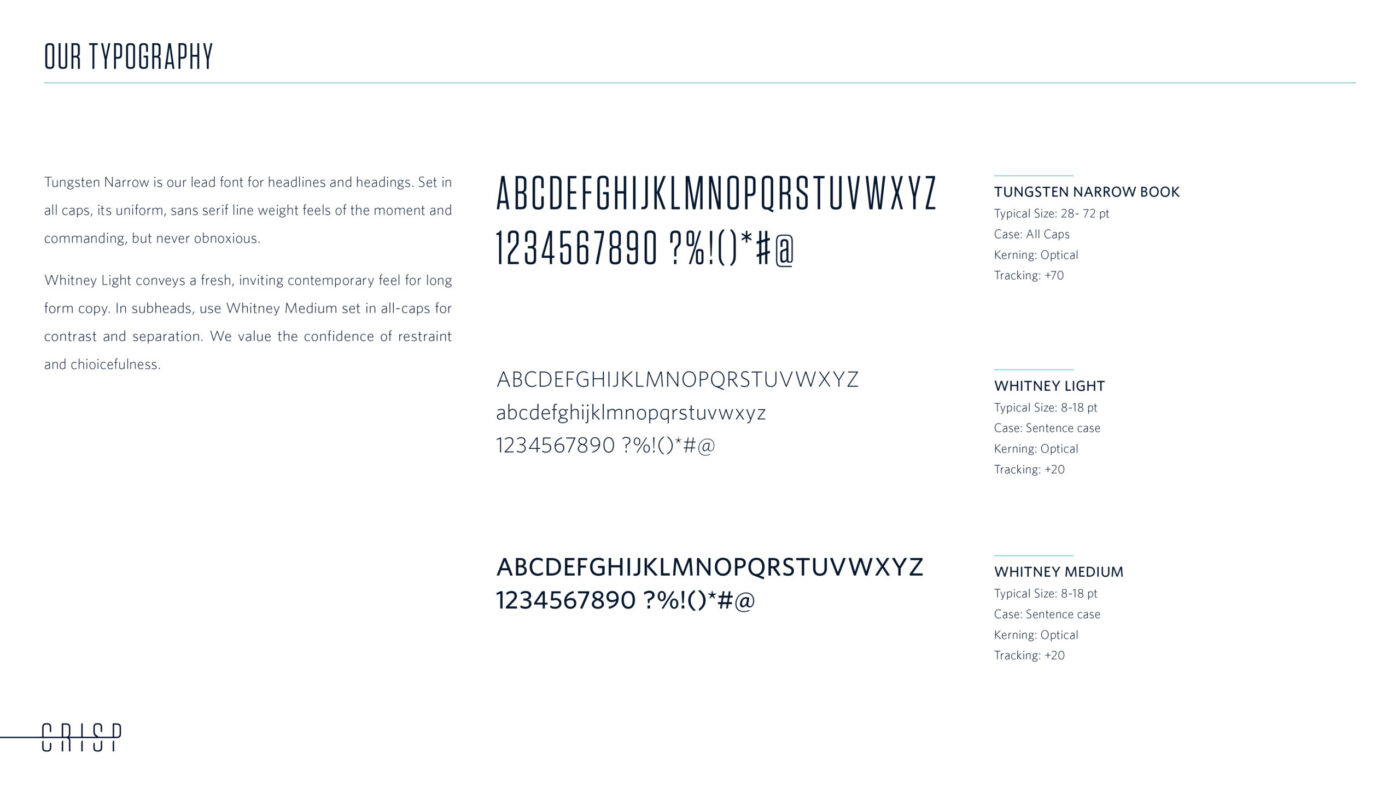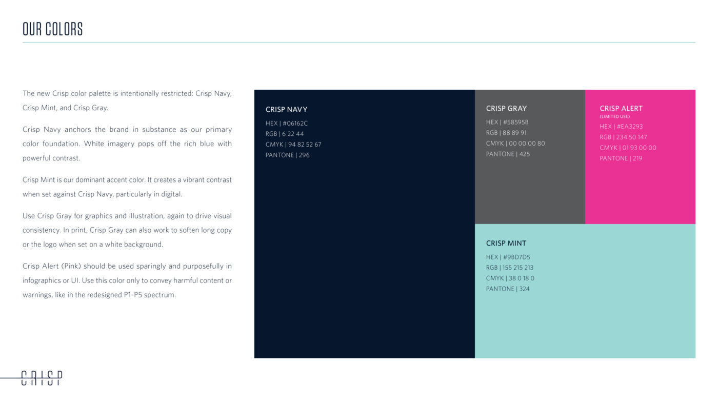 We created an online style guide to inform Crisp’s internal team in Leeds, along with its risk analysts and representatives around the globe. We update this guide regularly, evolving as new needs arise to ensure brand consistency in voice and look.