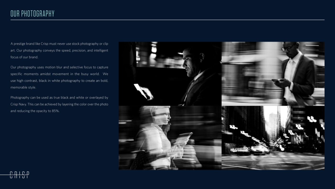 We developed a new logo and an entirely new identity system: colors, fonts, layouts and graphics. We also produced an image library of over 300 photographs, creating a distinctive look of blurred motion in urban environments to represent Crisp’s always-on, constantly moving nature.