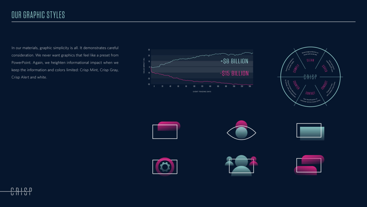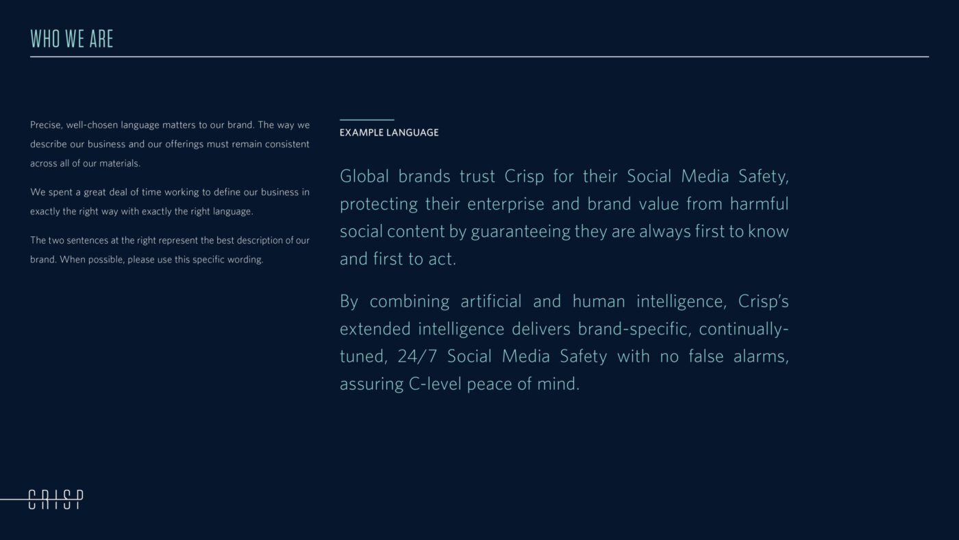 Based in Leeds, UK, Crisp wanted to expand the footprint of its world-leading social media safety solutions more broadly in the U.S. With an unmatched combination of security-grade AI and human risk analysts, Crisp needed a new brand identity that reflected the service’s exceptional quality.
