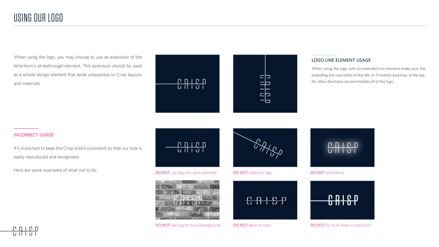 The singular horizontal line that divides the two halves of the letterforms represents the inexorable vigilance power of Crisp’s always-on AI. Creating shadows under that line lends the logo dimension and strength.